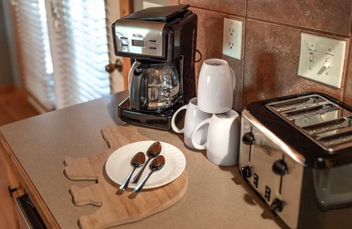 "Falling Leaf Lodge" has an open concept living and kitchen area. Big screen smart tv over the fireplace, plenty of seating and recliners in the living area and yet the cook can enjoy everyone while putting breakfast together. It is a great spot to enjoy a movie together, the Christmas tree that goes up in November or the crispness of fall. Guests split their time between the great room and the large screened in porch which also has seating and a great breeze. The kitchen is fully equipped with everything you need for preparing popcorn for game night or a holiday dinner. We provide all cookware, serving dishes, pizza pans and even a crock pot. The dining table seats 4; there is extra seating at the bar as well. WeLoveBranson also offers free WIFI, a complimentary basket of snacks, free coffee and all the starter paper products you need for a wonderful stay in Branson!